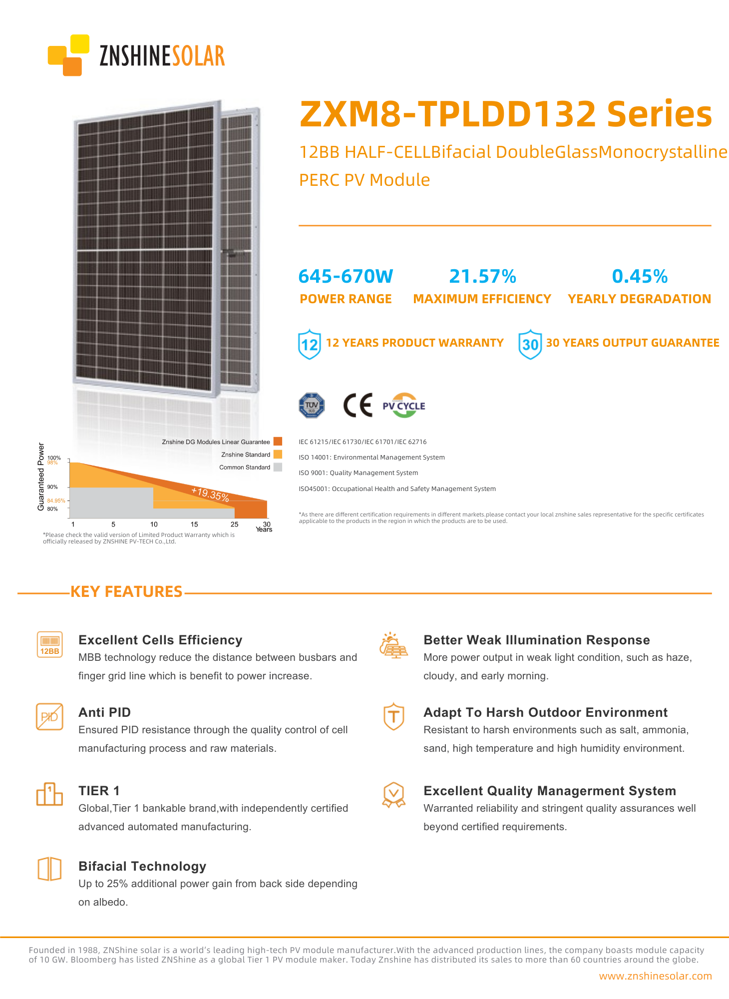 The complete 20.46kW pallet provides premium bifacial technology from a Bloomberg Tier 1 manufacturer with 10GW production capacity, offering exceptional value with double glass durability, comprehensive IEC certifications, and industry-leading performance backed by 30-year output guarantee with only 0.45% annual degradation.