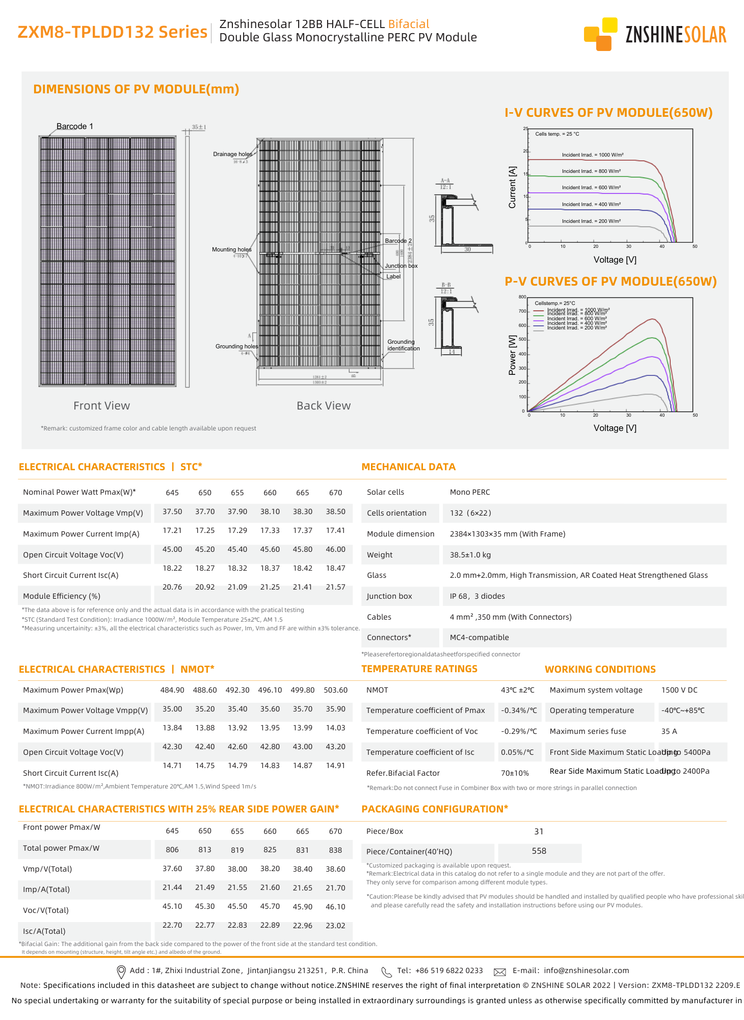 This pallet contains 31 ZNShine 660W bifacial double glass panels totaling 20.46kW, featuring cutting-edge 12-busbar half-cell technology that captures sunlight from both sides for up to 25% additional power generation beyond the rated capacity. Each panel utilizes 132 monocrystalline PERC cells achieving 21.25% efficiency with superior weak light response